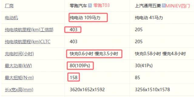 零跑T03纯电续航403km,电机马力109Ps,快充0.6h,慢充3.5h,0-50km/h加速时间4.1s;相比五菱宏光MINIEV四门版,纯电续航多出近200km啊,续航无压力;电机马力也高出68Ps,出行、爬坡动力充足;综合性能表现,比五菱宏光MINIEV四门还要更强。